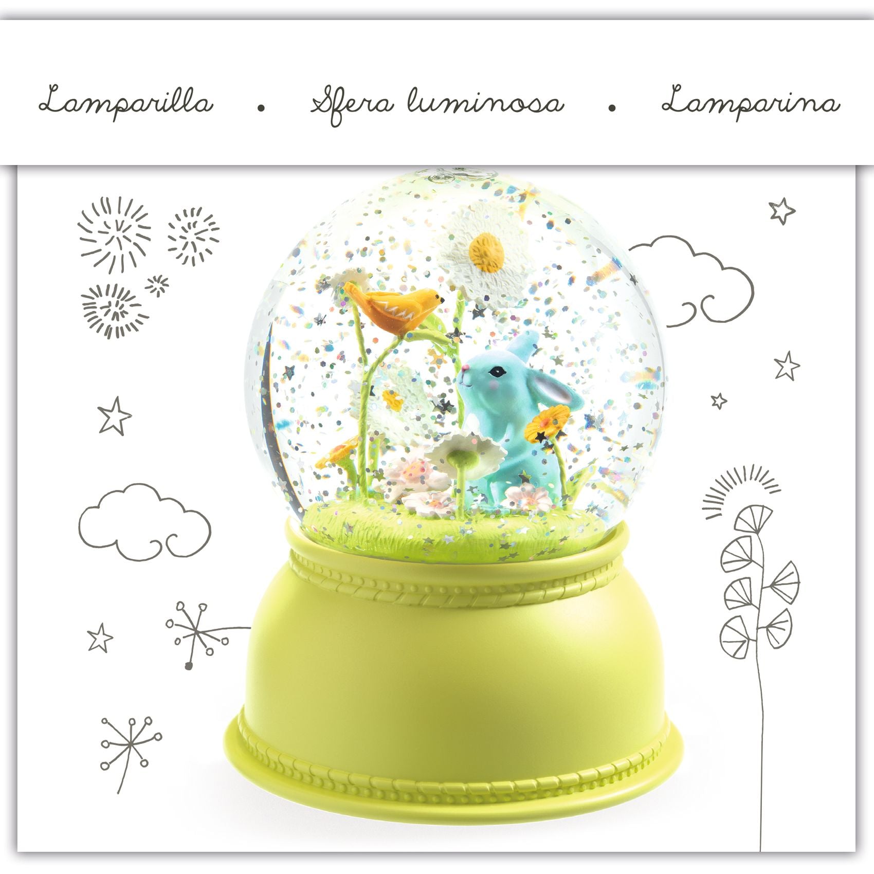 מנורת לילה מושלמת עם דמות ארנב,ברגע שהמנורה עובדת הנצנצים מתעופפים ויוצרים אווירה משגעת.וכל זה עם צבע אור שמתחלף. עובד עם 3 סוללות רגילות AA . המנגנון נכבה אוטומטית אחרי 45 דק, כדי ללשמור על הסוללה.