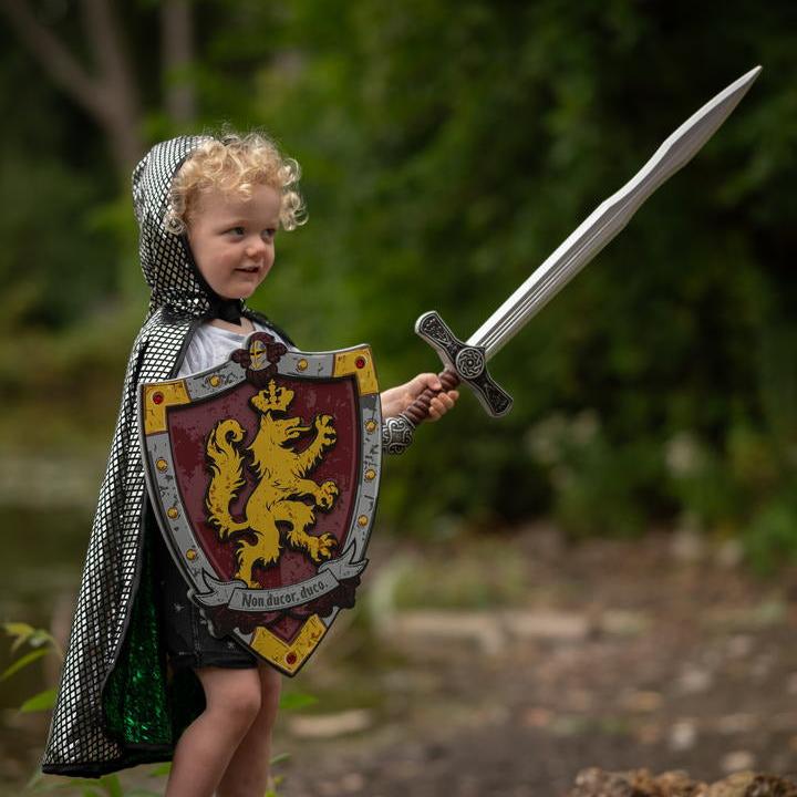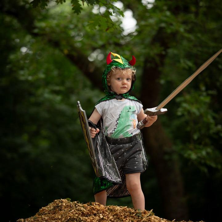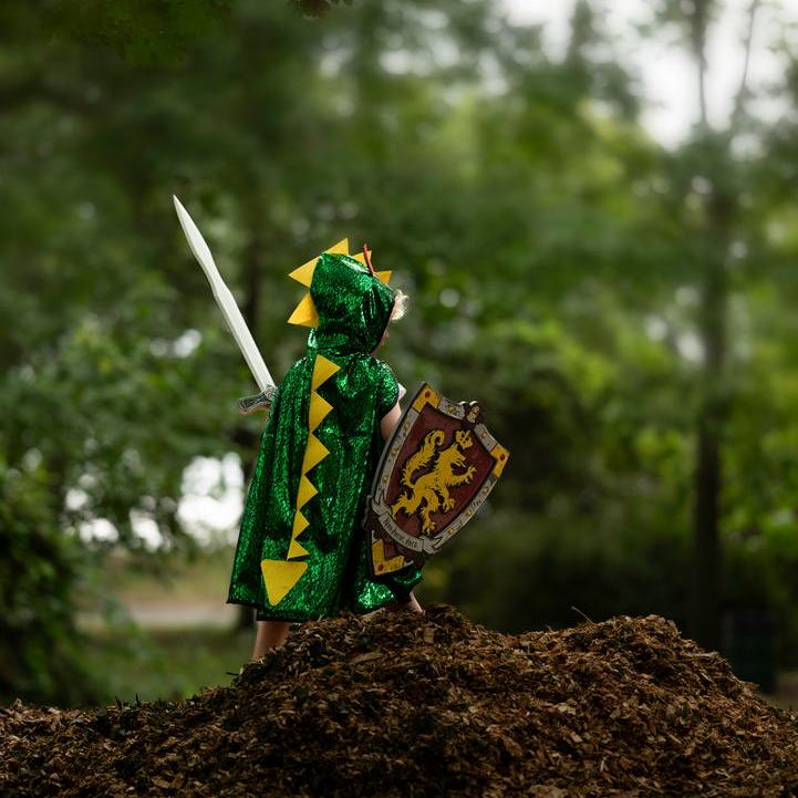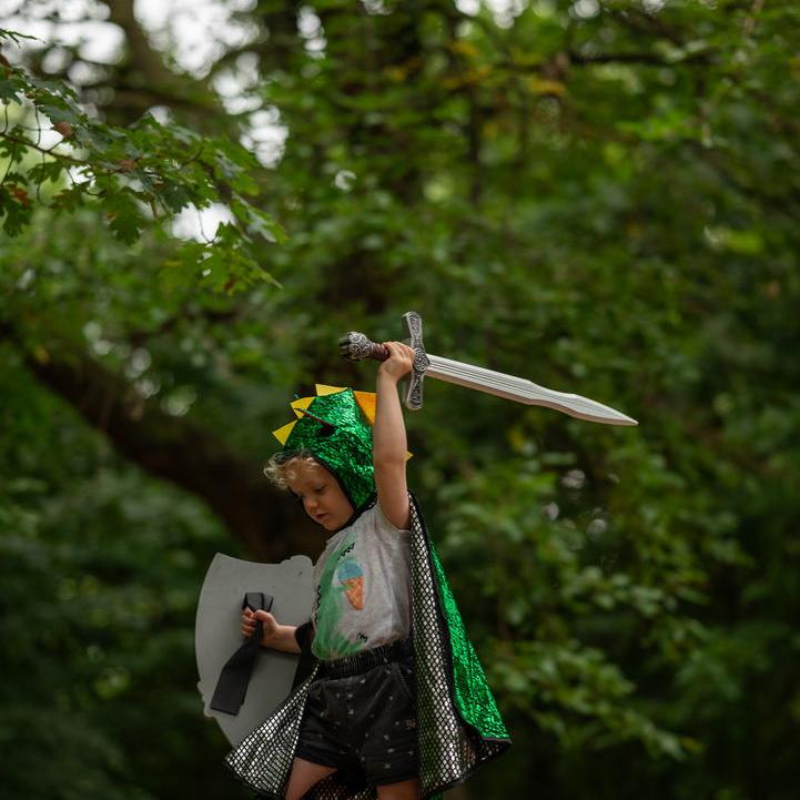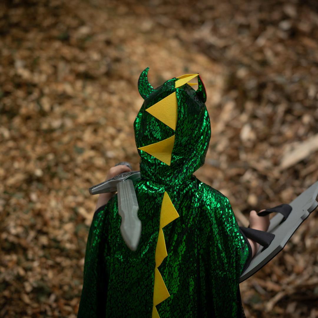 גלימה דו צדדית, פעם אתה דרקון ופעם אביר.ירוק/כסף,מאת חברה קנדית, המתמחה בתחפושות איכותיות,מתאים לכל עת (ולא רק בפורים) .תענוג להוסיף עוד הפתעות לארגז התחפושות, ולאפשר לילדים לעוף עם הדמיון.מתאים לגילאי 4-6 שנים.